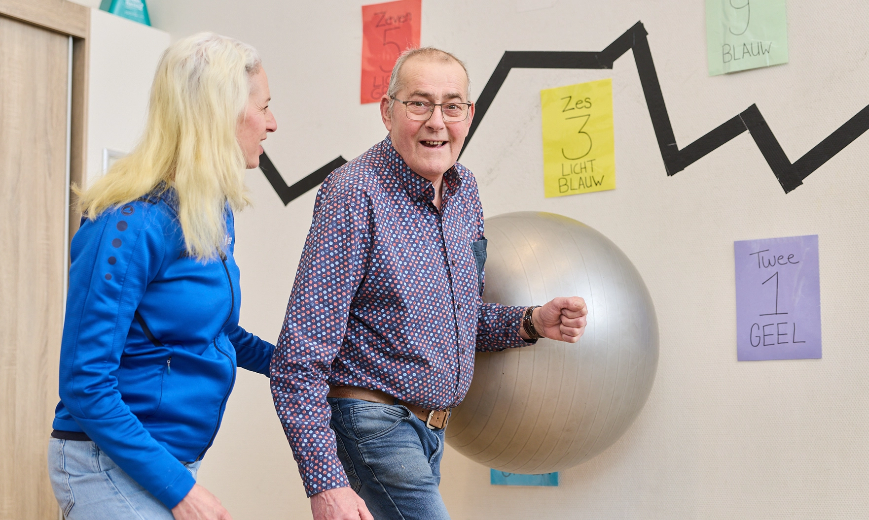 Fysiotherapeut Carolijn Wörmer schoof het COPD-protocol aan de kant en maakte een nieuw behandelplan. Binnen de fysiotherapie is vestibulairefysiotherapie een speciaal aandachtsgebied. Deze is gericht op herstel van de balans na een probleem met het evenwichtsorgaan. Het gecontroleerd opwekken van duizeligheid is een onderdeel van deze behandeling. Jan: ‘Ik moest me bijvoorbeeld opzij laten vallen om mijn brein te laten wennen aan een verstoord evenwicht en minder heftig te reageren. Maar al vrij snel bleek dit niet te werken en Carolijn kwam met een andere aanpak.’